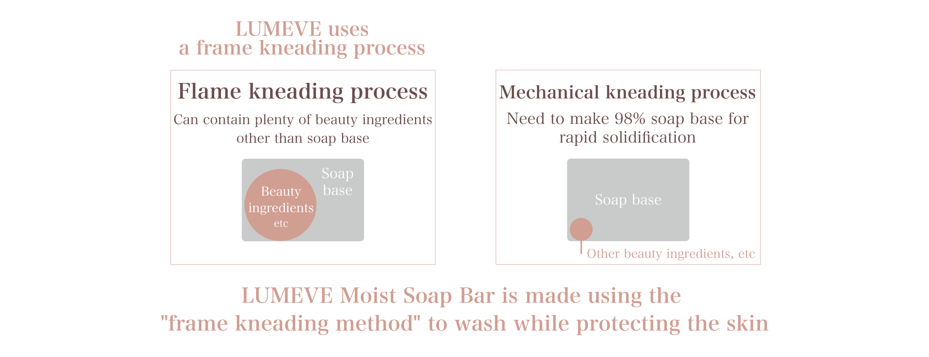 Solid soap is mildly alkaline and gently removes dirt and grime, and the frame kneading method allows the soap to contain more beauty essence ingredients than the machine kneading method and gently cleanses the skin.
