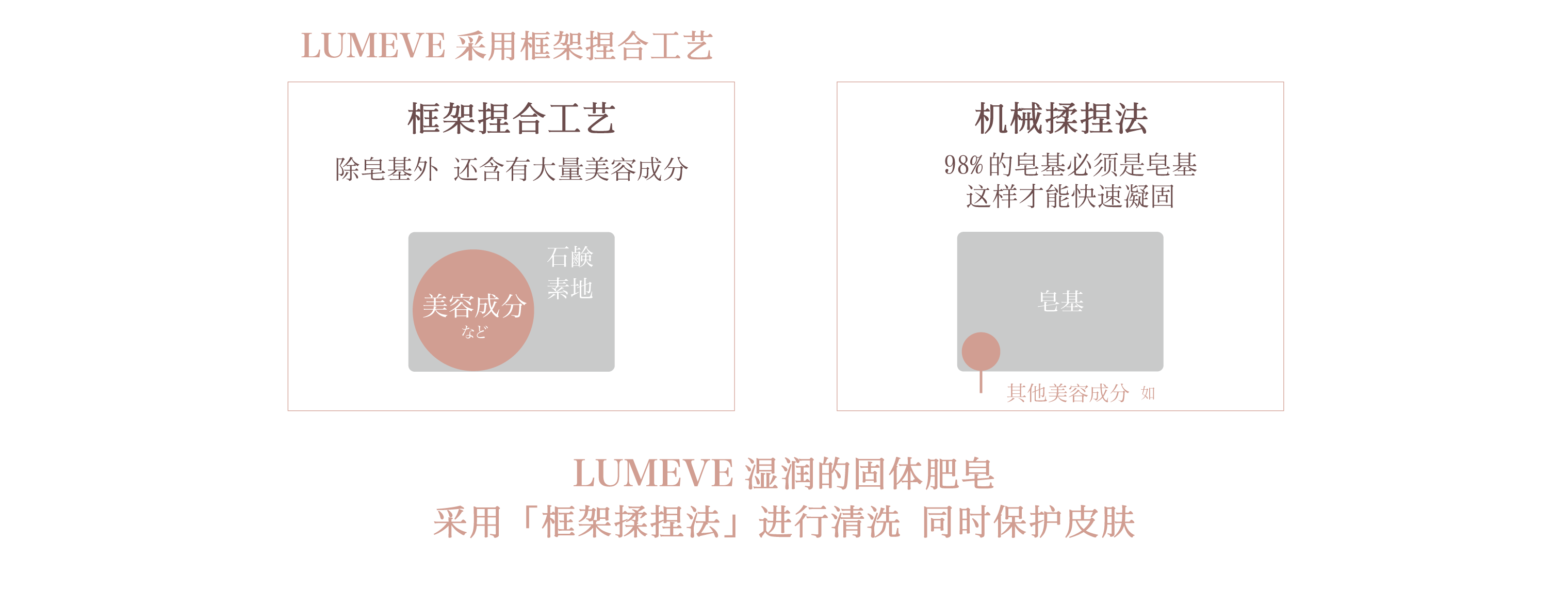 固体肥皂呈弱碱性,能温和地去除灰尘和污垢,框架揉捏工艺比机器揉捏工艺含有更多的化妆品成分,能温和地清洁皮肤